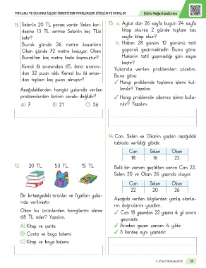 11. Selen’in 20 TL parası vardır. Selen kar- 13. a. Aykut dün 26 sayfa bugün 24 sayfa