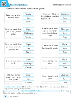 D. Özellikleri verilen şekilleri noktalı yerlere yazalım.