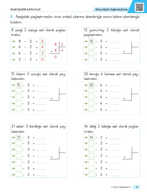 21 şekeri 3 bardağa eşit olarak pay- 14 çileği 2 tabağa eşit olarak paylaş-