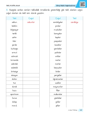 A. Aşağıda verilen isimleri tablodaki örneklerde gösterildiği gibi tekil olanları çoğul,