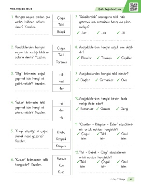 3. “Silgi” kelimesini çoğul -lik 9. Aşağıdakilerden hangisi tekil isimdir?