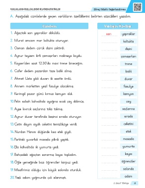 A. Aşağıdaki cümlelerde geçen varlıkların özelliklerini belirten sözcükleri yazalım.