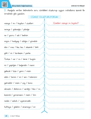 D. Aşağıda verilen kelimelerle soru cümleleri oluşturup uygun noktalama işareti ile