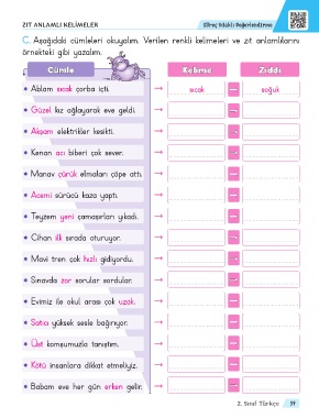 C. Aşağıdaki cümleleri okuyalım. Verilen renkli kelimeleri ve zıt anlamlılarını