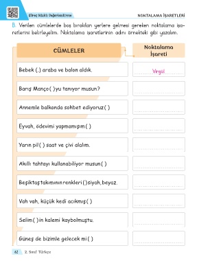 B. Verilen cümlelerde boş bırakılan yerlere gelmesi gereken noktalama işa-