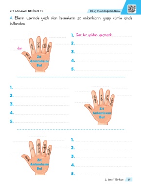 A. Ellerin üzerinde yazılı olan kelimelerin zıt anlamlılarını yazıp cümle içinde
