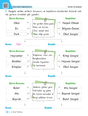 B. Aşağıda verilen şiirlerin konusunu ve başlıklarını kutulardan bularak nok-