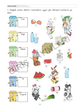 HAYAT BİLGİSİ A. Aşağıda verilen atıkların numaralarını uygun geri dönüşüm kutularına ya- zalım. 3 Cam 2 1 Kağıt 5 GİRİŞ YAYINLARI 4 Metal 6 10 9 Plastik 7 8 13 12 Pil 11 14 16 Organik 15 17 23