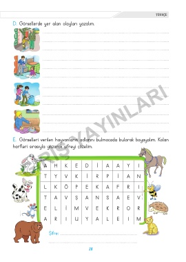 E. Görselleri verilen hayvanların adlarını bulmacada bularak boyayalım. Kalan