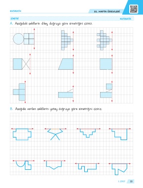 MATEMATİK 31. HAFTA ÖDEVLERİ SİMETRİ MATEMATİK A. Aşağıdaki şekillerin dikey doğruya göre simetriğini çiziniz. B. Aşağıda verilen şekillerin yatay doğruya göre simetriğini çiziniz. 3. SINIF 121