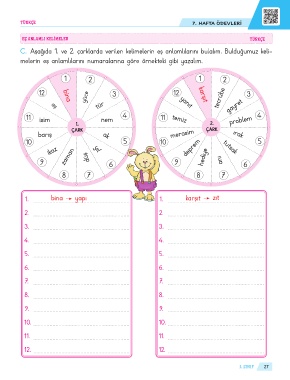 C. Aşağıda 1. ve 2. çarklarda verilen kelimelerin eş anlamlılarını bulalım. Bulduğumuz keli-
