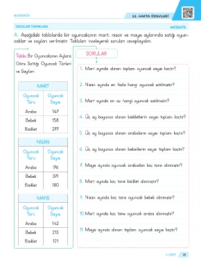A. Aşağıdaki tablolarda bir oyuncakçının mart, nisan ve mayıs aylarında satığı oyun-