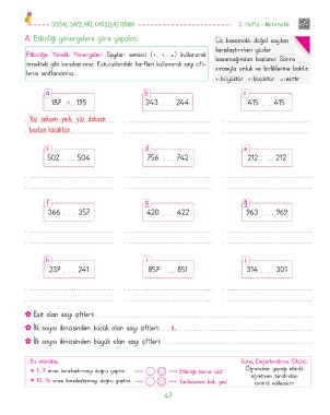 Etkinliğe Yönelik Yönergeler: Sayıları sembol ( > , < , = ) kullanarak basamağından başlanır. Sonra