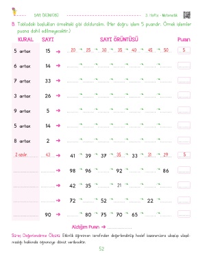 B. Tablodaki boşlukları örnekteki gibi dolduralım. (Her doğru işlem 5 puandır. Örnek işlemler