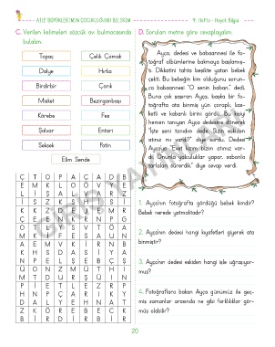 C. Verilen kelimeleri sözcük avı bulmacasında D. Soruları metne göre cevaplayalım.