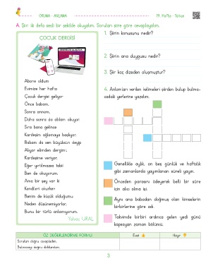 A. Şiiri iki defa sesli bir şekilde okuyalım. Soruları şiire göre cevaplayalım.