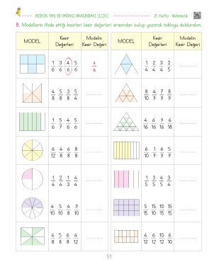 B. Modellerin ifade ettiği kesirleri kesir değerleri arasından bulup yazarak tabloyu dolduralım.
