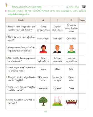 B. Tablodaki soruları “BİR YER DÜŞÜNÜYORUM” şiirine göre cevaplayalım. Doğru seçeneği