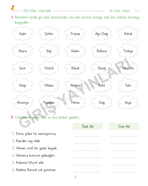 B. Cümlelerde geçen özel ve cins isimleri yazalım.