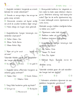 1. Aşağıdaki cümlelerin hangisinde eş anlamlı 6. Akvaryumdaki balıklarımı her izleyişimde on-