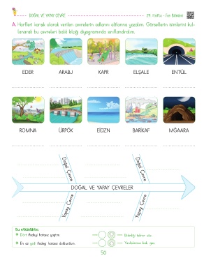 A. Harfleri karışık olarak verilen çevrelerin adlarını altlarına yazalım. Görsellerin isimlerini kul-
