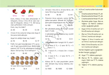 Cem, kilosu 2 lira olan elmalardan 4 6. Paramın önce yarısını, sonra 20 TL ● C marka sütün bir litresi 4 TL dir.