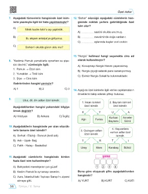7. Aşağıdaki tümcelerin hangisinde özel isim- 12. “Bahar” sözcüğü aşağıdaki cümlelerin han-