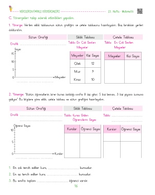 1. Yönerge: Verilen sıklık tablosunun sütun grafiğini ve çetele tablosunu hazırlayalım. Boş bırakılan yerleri