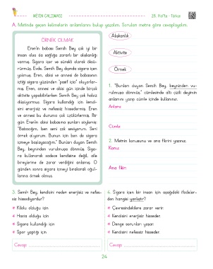 A. Metinde geçen kelimelerin anlamlarını bulup yazalım. Soruları metne göre cevaplayalım.