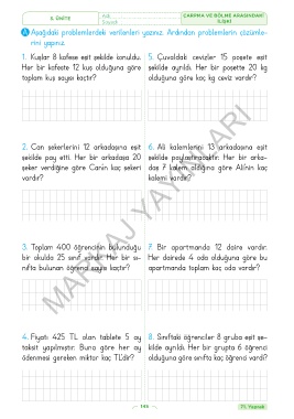 1. Kuşlar 8 kafese eşit şekilde konuldu. 5. Çuvaldaki cevizler 15 poşete eşit