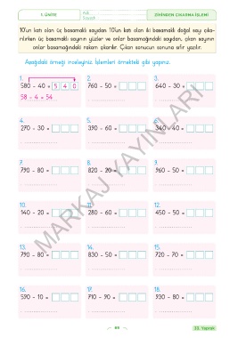 1. ÜNİTE Adı : ZİHİNDEN ÇIKARMA İŞLEMİ