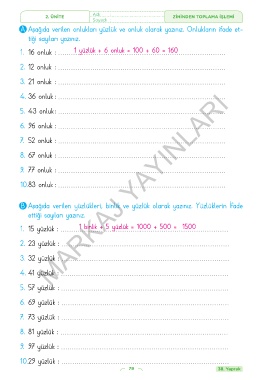 A Aşağıda verilen onlukları yüzlük ve onluk olarak yazınız. Onlukların ifade et-