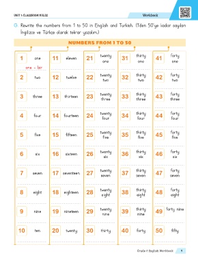G. Rewrite the numbers from 1 to 50 in English and Turkish. (1’den 50’ ye kadar sayıları