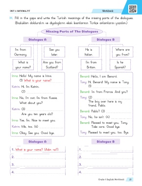 H. Fill in the gaps and write the Turkish meanings of the missing parts of the dialogues.