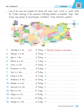 the Turkish meanings of the sentences. (Haritaya bakalım ve boşlukları “doğu”, “batı”,