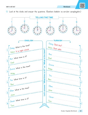 G. Look at the clocks and answer the questions. (Saatlere bakalım ve soruları cevaplayalım.)