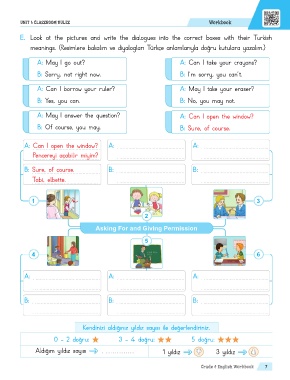 E. Look at the pictures and write the dialogues into the correct boxes with their Turkish