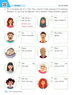 D. Fill in the blanks with “is” or “has”. Then, write the Turkish meanings of the sentences.