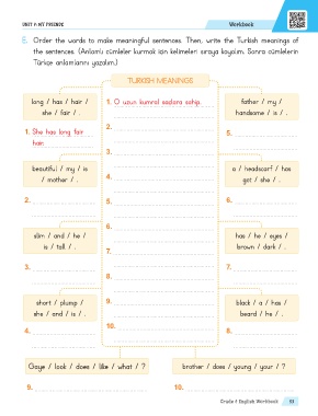 E. Order the words to make meaningful sentences. Then, write the Turkish meanings of
