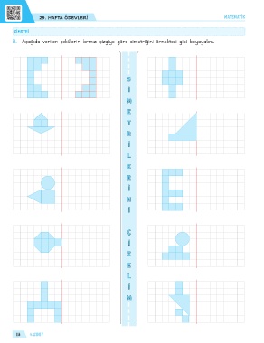 B. Aşağıda verilen şekillerin kırmızı çizgiye göre simetriğini örnekteki gibi boyayalım.