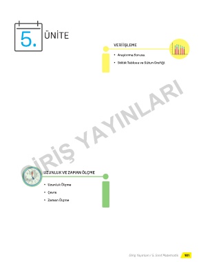 5. ÜNİTE VERİ İŞLEME • Araştırma Sorusu • Sıklık Tablosu ve Sütun Grafiği GİRİŞ YAYINLARI UZUNLUK VE ZAMAN ÖLÇME • Uzunluk Ölçme • Çevre • Zaman Ölçme Giriş Yayınları / 5. Sınıf Matematik 101