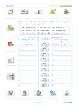 Exercise 4: Look at the clocks and write the time with its Turkish meaning. (Saatlere