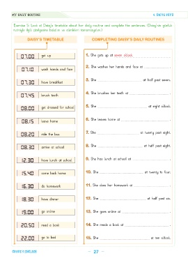Exercise 5: Look at Daisy’ s timetable about her daily routine and complete the sentences. (Daisy’ nin günlük