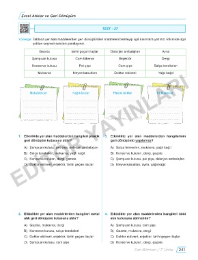 Yönerge: Tabloda yer alan maddelerden geri dönüştürülen maddeleri belirleyip ilgili kısımlara yazınız� Etkinlikle ilgili