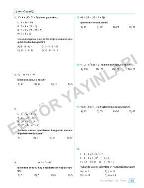 11. 2 + 4 x (3 - 5 ÷ 5) işlemi yapılırken; 15. 40 - (20 - (10 - 5 ÷ 5))