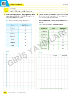 1. Asya'nın bir hafta boyunca günlük okuduğu sayfa 2. Yusuf'un deneme sınavlarında Türkçe ve Matematik