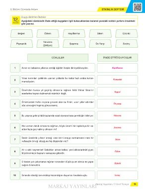 Aşağıdaki cümlelerin ifade ettiği duyguları ilgili kutucuklardan bularak yandaki noktalı yerlere örnekteki