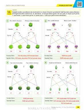 14. Aşağıda bezelye çaprazlamasında ata bireylerin ve oluşan bireylerin genotiplerini ilgili kısımlara yazınız. Bezelye-