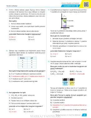 8. Kırmızı lahana salatası yapan Zeynep, kırmızı lahana 11. X çözeltisi turnusol kağıdının rengini kırmızıya çevirirken