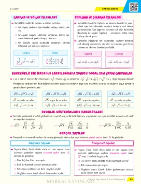 Q Kareköklü ifadelerde çarpma ve bölme yapılırken; Q Kareköklü ifadelerle toplama ve çıkarma işlemlerini yapa-